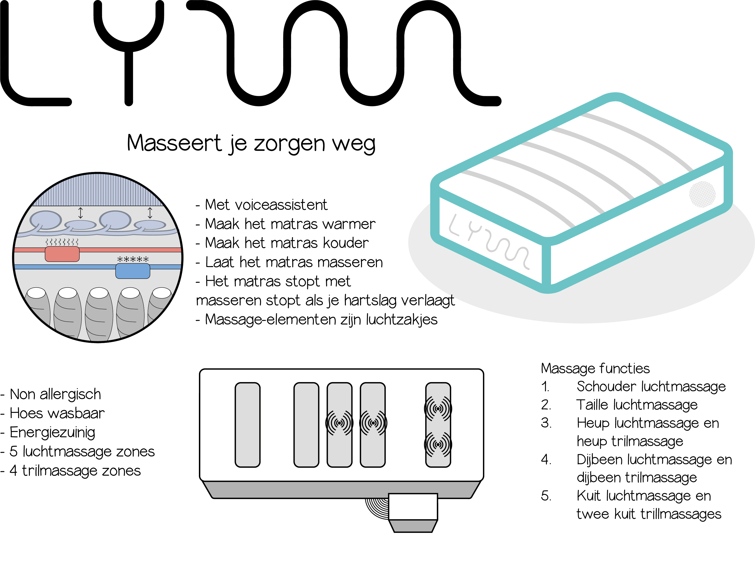 Het project is verdeeld in 4 categoriƫn. Interactie ontwerp, hier hield Nils zich mee bezig. Vormgeving en Branding, hier hield Damian zich mee bezig. Video prototype, hier hield Lars zich mee bezig. Fysiek product, hier hield ik me mee bezig. We kwamen als 'dreamteam' al snel op het idee om een masserend matras te maken die je met je stem kan bedienen. De eerste foto hieronder zijn de details van het matras. De tweede foto is mijn eerste ervaring met 3D printen.