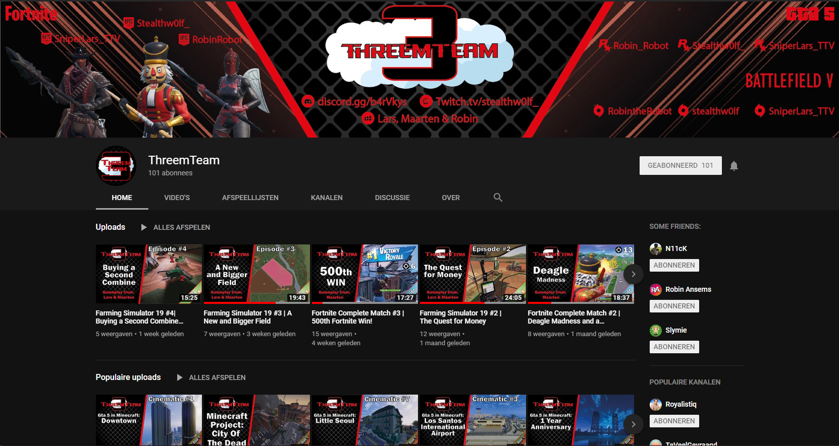 Samen met Lars en Maarten hebben wij een Youtube-kanaal waar wij filmpjes op plaatsen van de games die wij spelen. Het logo, de banner en alle thumbnails heb ik gemaakt. Threem staat voor three, met z'n drieën. En de 'm' achter three staat dan voor de dream, een dreateam. Maar dan threemteam omdat we met z'n driën zijn.