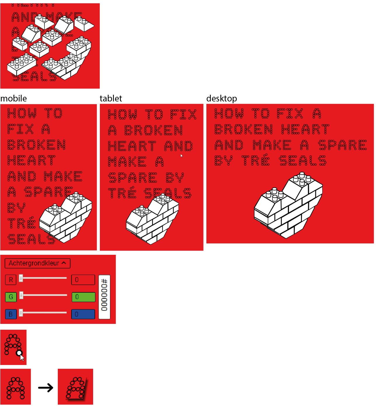 Nadat ik het gehele kunstwerk in HTML en CSS had nagemaakt heb ik verschillende interacties toegevoegd aan het kunstwerk. Van boven naar onder, je kan het hartje uit elkaar halen, het kunstwerk is responsive, je kan de kleur van de achtergrond veranderen, je kan hover gebruiken op het kunstwerk en je kan je toetsen gebruiken om de tekst 3D te laten zien.